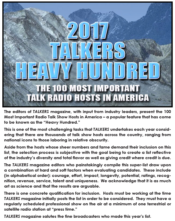 2017 TALKERS Heavy Hundred 1-25 1 – 25 | 26 – 50 | 51 – 75 | 76 – 100 | Share this with your network Click to print (Opens in new window) Print Click to email a link to a friend (Opens in new window) Email Click to share on X (Opens in new window) X Click to share on Facebook (Opens in new window) Facebook Click to share on LinkedIn (Opens in new window) LinkedIn Click to share on Reddit (Opens in new window) Reddit